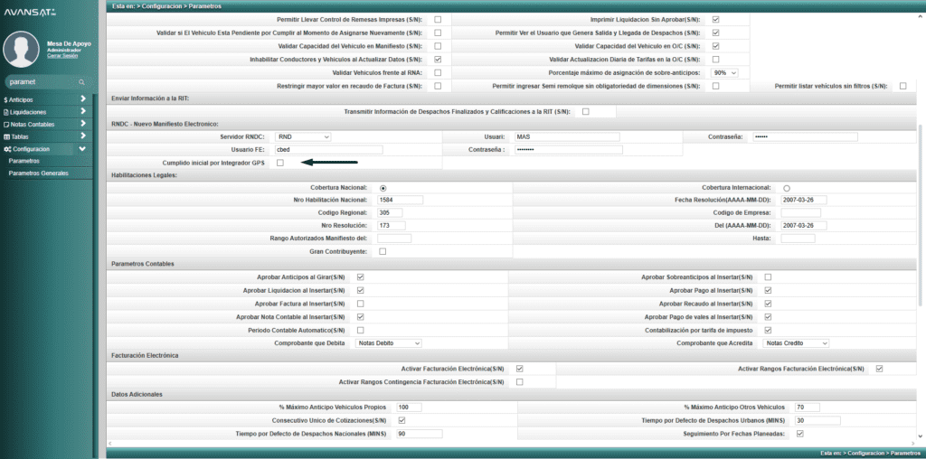• Para activar esta funcionalidad, deberá contar con el parámetro “Cumplido inicial por integrador GPS” activado. Este parámetro se encuentra en el módulo “Configuración > Parámetros”, dentro de la sección “RNDC – Nuevo Manifiesto Electrónico”. Es importante tener en cuenta que, al activar esta opción, el sistema puede presentar una leve lentitud, ya que deberá consultar la información proporcionada por el RNDC para asociar las fechas correspondientes.