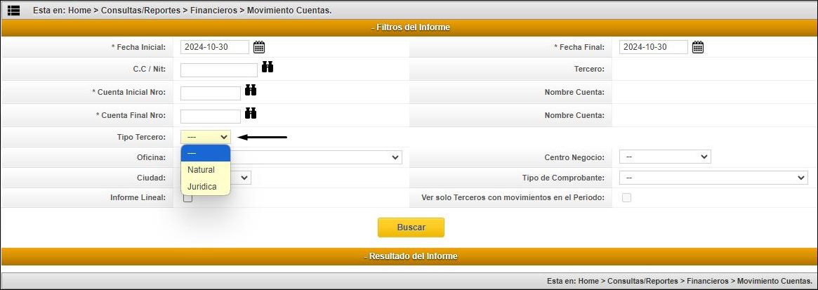 En las rutas “Consultas/Reportes > Financieros > Movimiento Cuentas. / Inf. bas/ret en la fuente” visualizará la inclusión del campo “Tipo Tercero” el cual permitirá filtrar la información del informe dependiendo de qué tipo de persona (Natural o Jurídica) sea seleccionada en el nuevo campo. Es importante resaltar que, si el tercero a buscar no tiene asociado ningún tipo de persona, el sistema mostrará el tipo de persona como “Otro”.