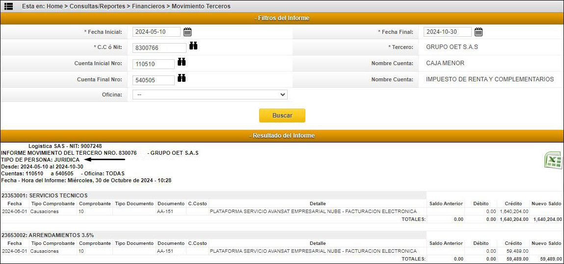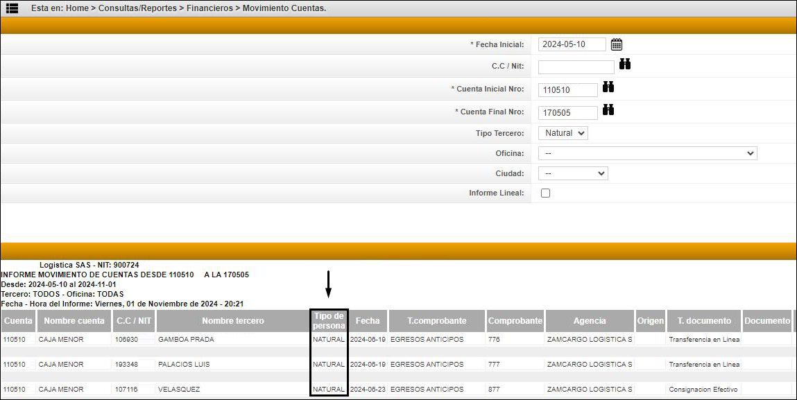 De igual forma, en la ruta “Consultas/Reportes > Financieros > Movimiento Terceros” al realizar la generación del informe, visualizará la inclusión del tipo de persona en el informe, tal como se observa en la siguiente imagen: