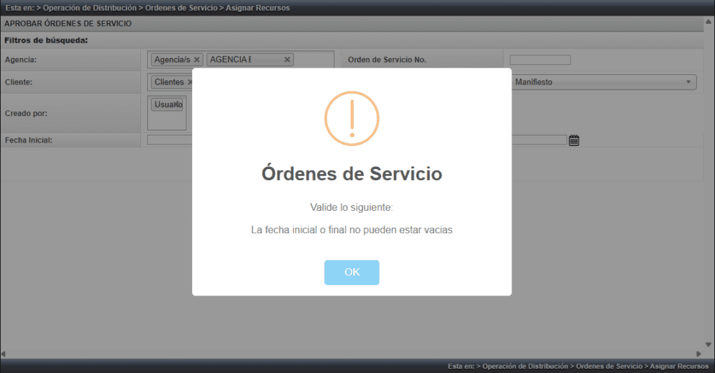 Los campos “Fecha Inicial / Fecha Final” deberán diligenciarse obligatoriamente para ejecutar la búsqueda, en caso contrario, el sistema generará le siguiente mensaje de validación: “La fecha inicial o final no pueden estar vacías”.