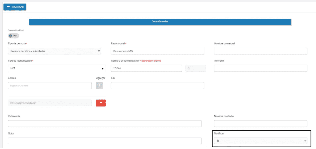 • Notificación activa en el catálogo de clientes: el cliente debe tener configurado el campo “Notificar” en “Sí”, para garantizar el historial de entrega requerido por la DIAN.