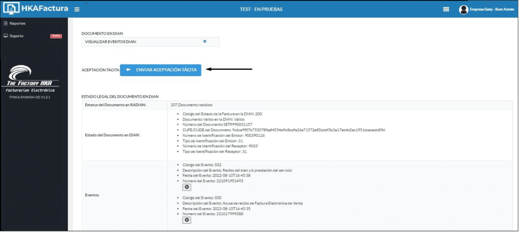 • Para verificar el estado “Aceptado” o “Rechazado”, presione el botón (+) en la sección de Aceptación Tácita. Se desplegará la respuesta oficial de la DIAN.
