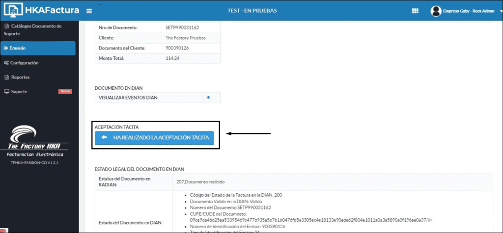 • Ingrese al módulo “Documentos Emitidos”, opción “Detalle”, una vez allí deberá dar clic en el botón “Enviar Aceptación Tácita”, como se muestra a continuación: