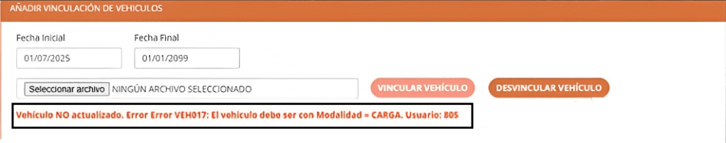 Este mensaje puede aparecer al intentar vincular un vehículo nuevo en el RNDC2, indicando: “Vehículo no actualizado. Error VEH017: El vehículo debe ser con Modalidad = CARGA”.