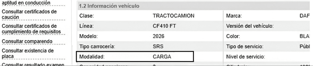 Para solucionarlo se debe verificar que en el sistema de tránsito la modalidad del vehículo esté registrada como “Carga”.