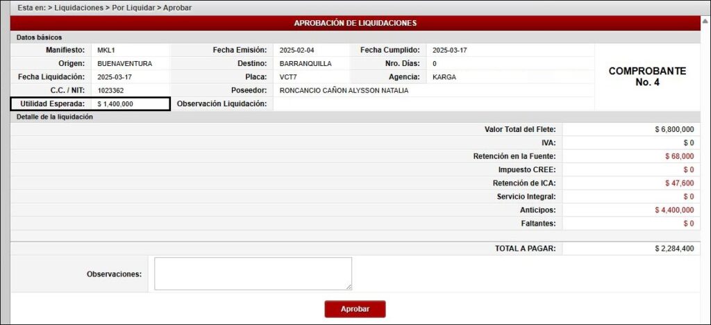 - Al aprobar la liquidación del manifiesto asociado, visualizará en el campo “Utilidad Esperada” el valor de la utilidad, calculado como la diferencia entre el valor facturado y el valor del flete.